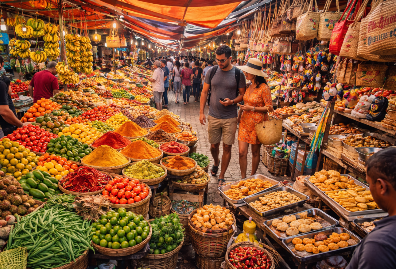 Inside the market, visitors will find a wide variety of fresh fruits, vegetables, spices, and herbs. The colorful displays and lively atmosphere make it a great place for photography and cultural discovery. On the upper level, there are stalls selling clothing, handicrafts, and souvenirs, making it the perfect place to shop for gifts.